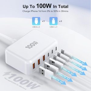USB C Fast Charger, 100W GaN 6 Port Type USB C Charging Station Hub Block Cube, USB C Wall Charger Power Strip Adapter Plug for iPad iPhone 16 15 14 13 12 Pro Max Pixel Note Galaxy, 5ft Cord